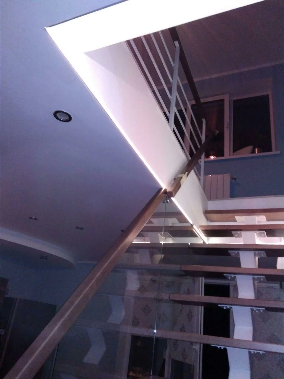 Сходи зі скла і металу мають оригінальний дизайнерський вигляд, здатний прикрасити будь-яке приміщення. Єдиний марш, без поворотів і проміжних майданчиків, вражає своїми розмірами і підкреслює висоту і простір приміщення.